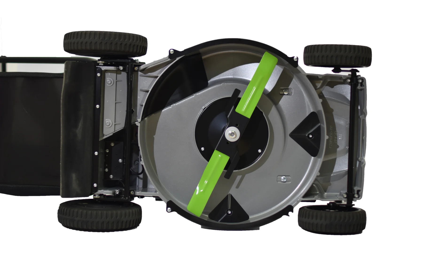 Устройство оснащено легкой, прочной и устойчивой к коррозии алюминиевой декой шириной 56 см. Толщина деки составляет 5 мм. Нож деки имеет прямой привод от мощного бесщеточного двигателя DigiPro™TM . В зависимости от задачи можно выбрать частоту вращения ножей: 2800 или 3000 об/мин или Авторежим, при котором обороты стартуют с отметки 2600 и далее регулируются автоматически. Устройство имеет две функции: сбор в травосборник и мульчирование.