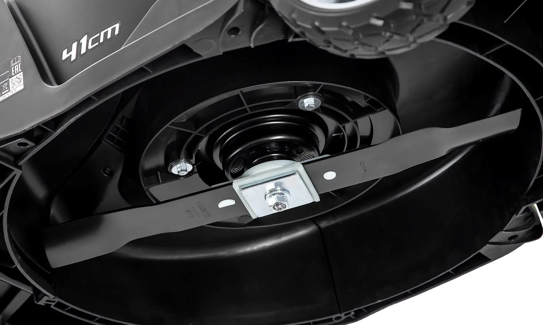 Газонокосилка обладает небольшим весом 13,2 кг и компактными размерами, что обеспечивает высокую маневренность и удобство. Также за счет каркасного травосборника устройство занимает минимум места при хранении. Корпус деки сделан из ударопрочного пластика, благодаря которому дека устойчива к попаданию посторонних предметов. Благодаря увеличенной конструкции батарейного отсека модель можно использовать с аккумулятором 8 Ач.