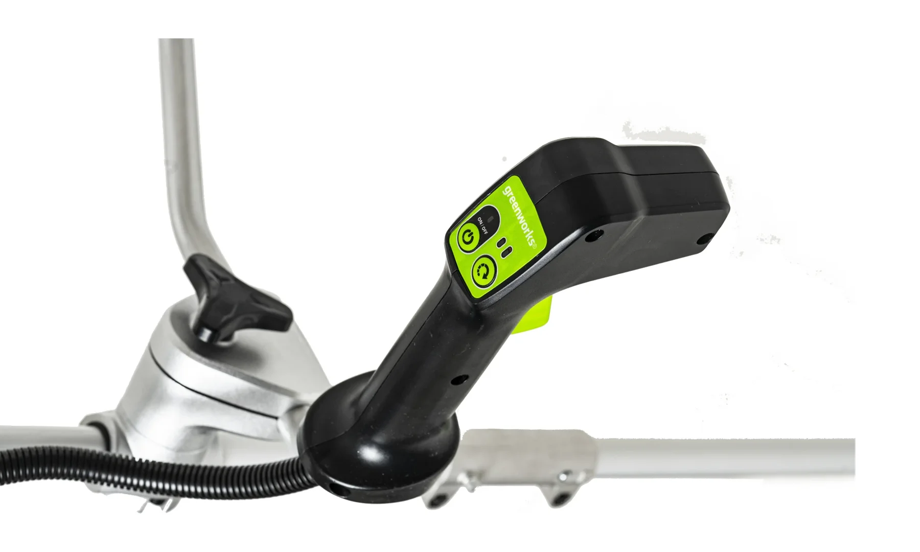 Триммер аккумуляторный Greenworks GD60BCB 60V, 40 см, бесщеточный с велосипедной ручкой, без АКБ и ЗУ – садовый инструмент из полупрофессиональной линейки 60V. Отличная замена бензинового или электрического инструмента в большом загородном хозяйстве. Легко справится с высокой и густой травой как на обширном открытом участке, так и в труднодоступных местах. Профессиональная велосипедная рукоятка оптимальная для производительной работы на больших площадях. В комплект поставки входит двух лопастной стальной нож для жесткой травы или мелкой поросли.
