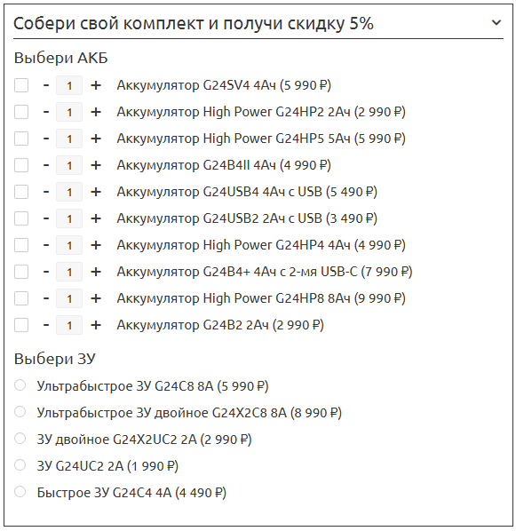 В комплект можно добавить несколько видов аккумуляторов в неограниченном количестве, но зарядное устройство можно выбрать только одно.